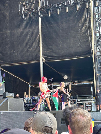 Halfway through the set, Chris swaps out his microphone for Milla’s bass, adorned with the Palestine flag. This band may have a retro rock sound, but they’re modern activists. Milla is intimidating, stomping around and whipping a chain on stage. Her scream vocalisations are impressive, even if not to everyone’s taste, in I Just Met The Biggest Cunt in the World and Fill Me With Your Trash. The singers’ antics are impressive, constantly swinging mics, throwing guitars, and flinging themselves at each other to catch.